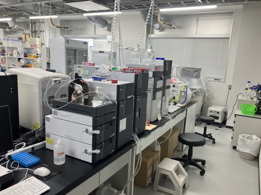 特殊なものは少ないですが、HPLC(液クロ)は5台あり、フル稼働しています。バイオ系のラボとしては多い方かもしれません。糖鎖を1個ずつ繋いでいく酵素の活性を測るには、これが必要不可欠です。糖鎖は物性の差が非常に微妙で、分離がとても難しい。これは、かつて大阪大学のグループなどが開発した日本独自の精緻な分析技術に支えられています。