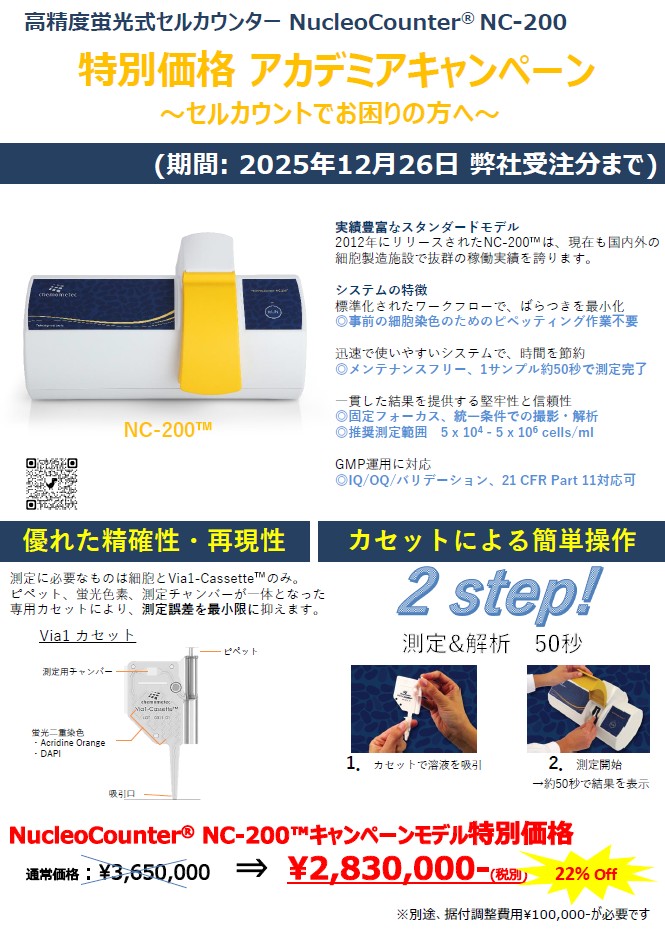 | 対象製品 | NucleoCounter® NC-200™(エムエステクノシステムズ) |