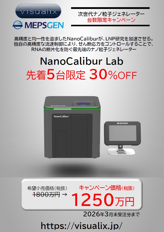 この度、創薬研究を加速する革新的な製品、次世代ナノ粒子ジェネレーター「Nanocalibur」の台数限定キャンペーンを開始します。