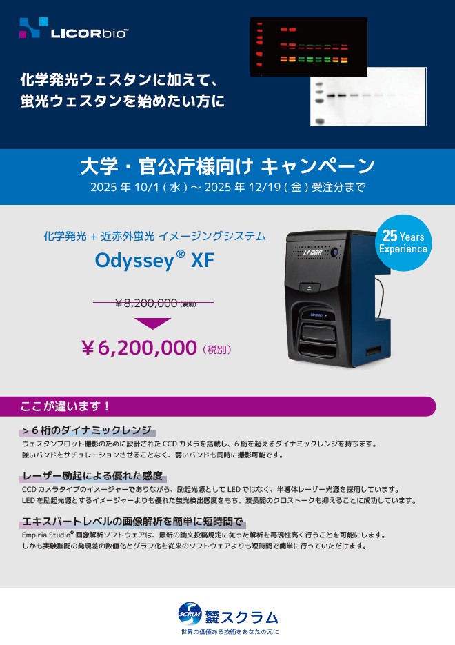 | 対象製品 | 近赤外蛍光+化学発光 CCDイメージング装置 Odyssey XF イメージングシステム(スクラム) |