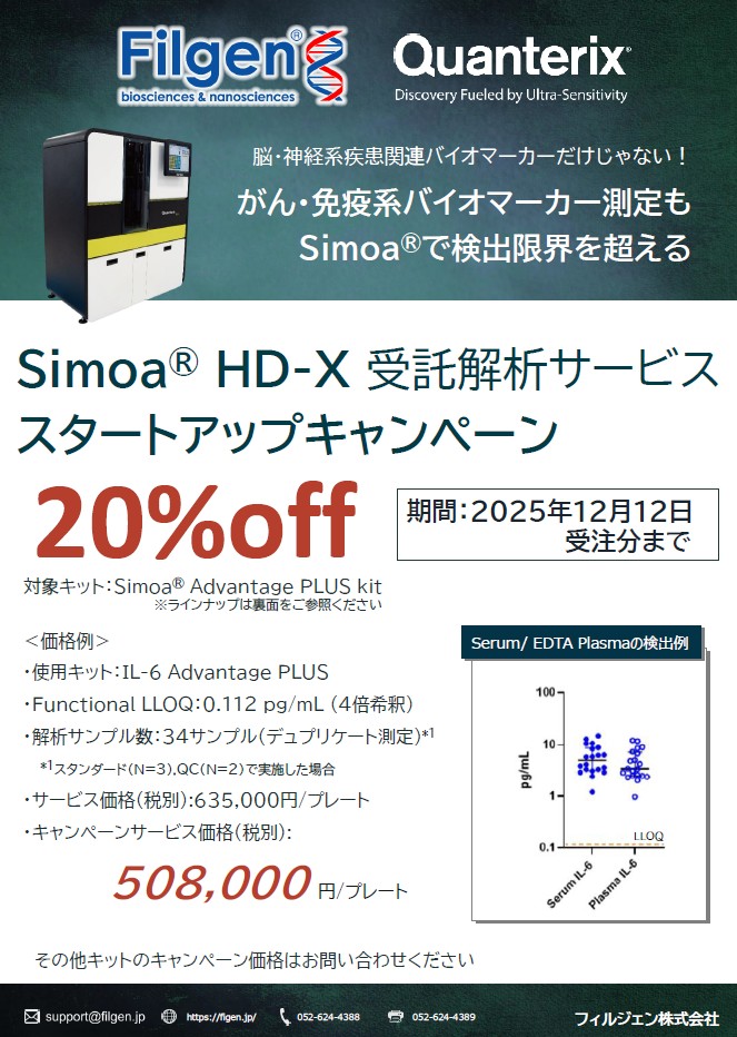 | 対象製品 | Simoa™ (超高感度デジタルELISA)受託解析サービス(フィルジェン) |