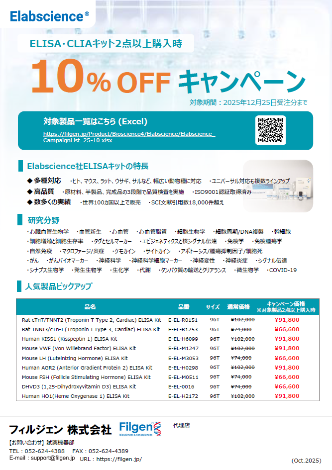 ELISA・CLIAキット2点以上購入時 10%OFFキャンペーンフィルジェン