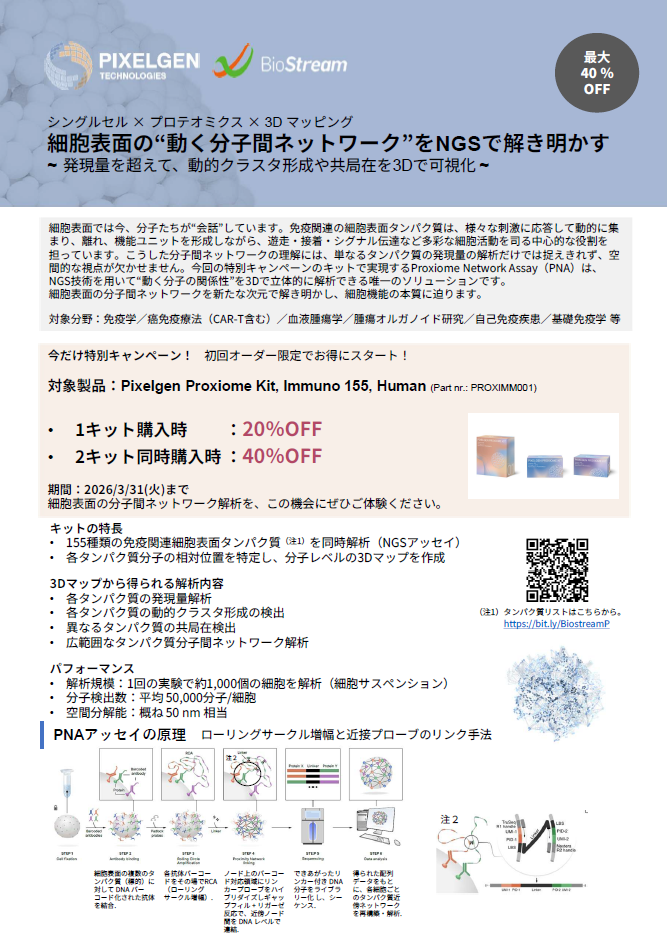 Pixcelgenーシングルセル × プロテオミクス × 3D マッピング 細胞表面の分子間ネットワーク解析バイオストリーム